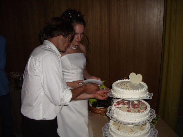 Helena & Stephan beim Anschneiden der dreistöckigen Hochzeitstorte