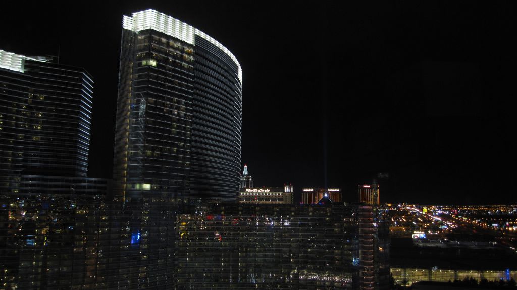 Las Vegas by Night, das neue CityCenter Hotel "Aria" im Vordergrund, und dahinter das "Monte Carlo" und er Lichtkegel der Hotelpyramide "Luxor"