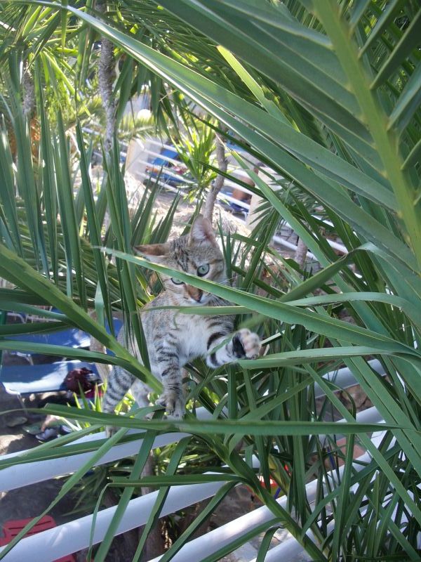... und zwar eine Heuschrecke, die von ihr beherzt mit der Pfote von der Palme geohrfeigt,