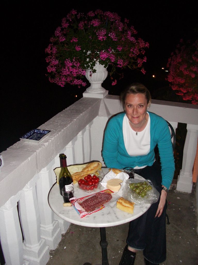 französisches Abendbrot mit Weichkäse, Baguette, Trauben und einem Gläschen Bordeaux