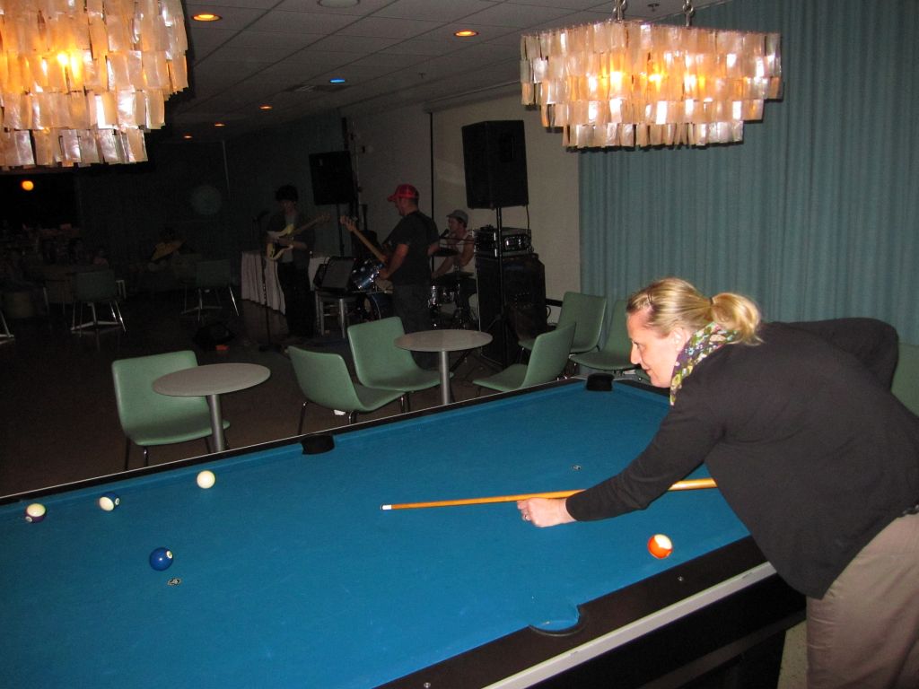 im Vordergrund: Tina beim Pool-Billard, im Hintergrund: die Kapelle "Dagga"